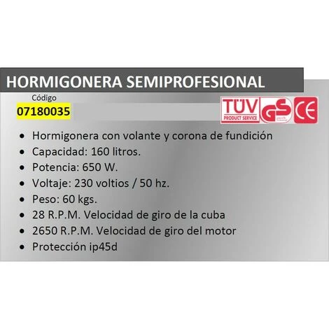 Bétonnière 160 litres/650 W. Couronne de fonte démontableBétonnière avec volant et couronne de fonte semi-professionnelle.